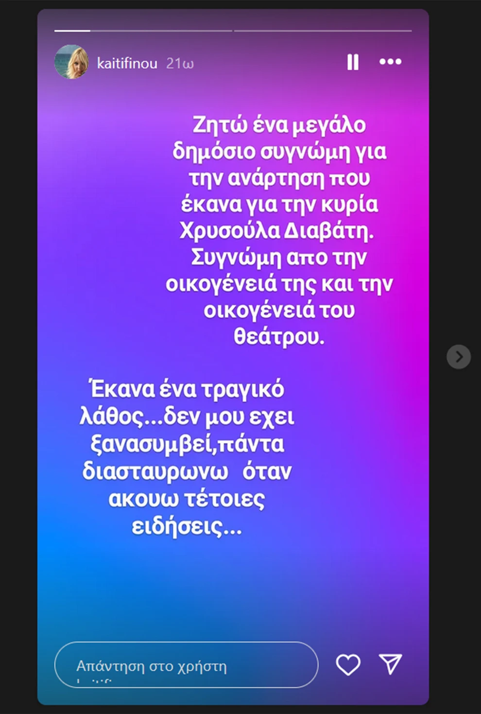 Η ίδια επικοινώνησε τηλεφωνικά με την εκπομπή «Το Πρωινό», εξηγώντας ότι μπέρδεψε φωτογραφία της Άννας Κυριακού με εκείνη της Χρυσούλας Διαβάτη, καθώς η είδηση του θανάτου της πρώτης κυκλοφόρησε την ίδια ημέρα.