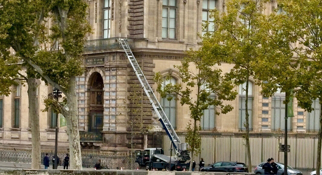 Οι αναρτήσεις της εταιρείας δείχνουν το διάσημο πλέον ανυψωτικό μηχάνημα, που χρησιμοποίησαν οι ληστές για να εισβάλουν στο μουσείο, να αρπάξουν κοσμήματα αξίας 88 εκατομμυρίων ευρώ και, μέσα σε λιγότερο από δέκα λεπτά, να εξαφανιστούν.