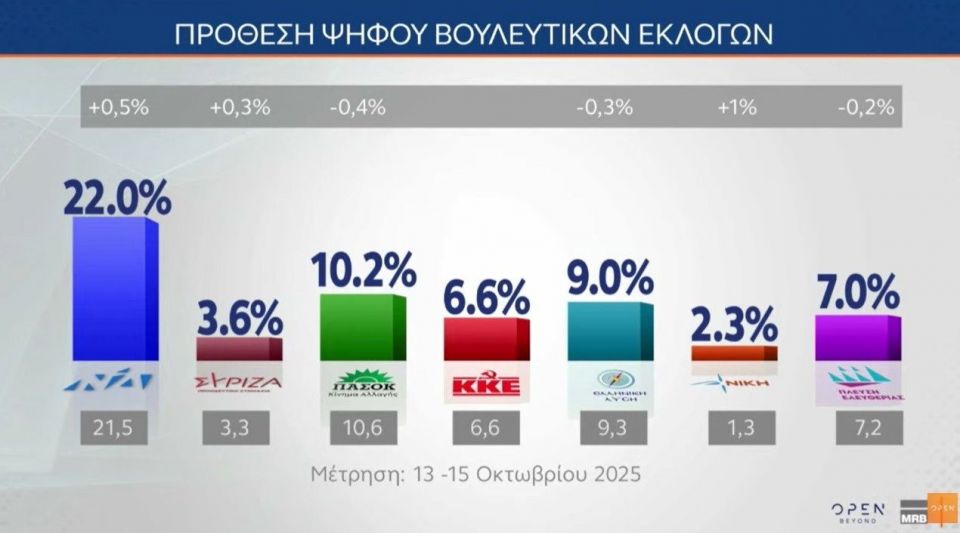 Ως προς την πρόθεση ψήφου η Νέα Δημοκρατία διατηρεί την πρώτη θέση με 22% καταγράφοντας διπλάσια διαφορά από το ΠΑΣΟΚ που ακολουθεί με 10,2%.