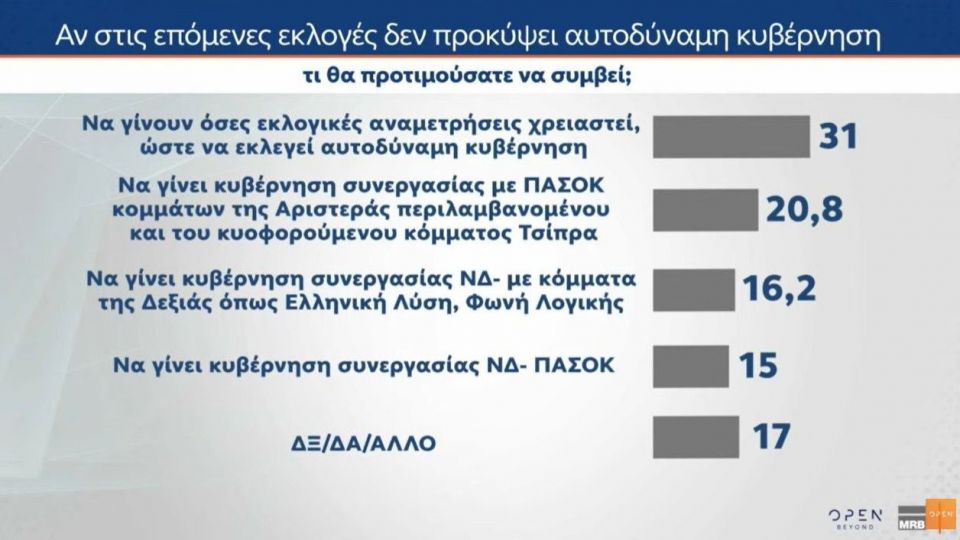 - Να γίνουν όσες εκλογικές αναμετρήσεις χρειαστεί, ώστε να εκλεγεί αυτοδύναμη κυβέρνηση 31%