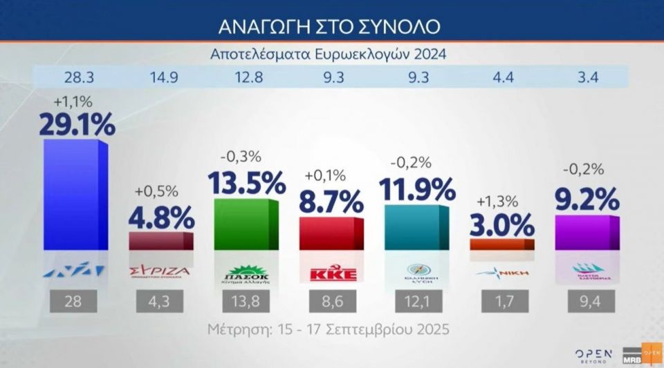 Στην τρίτη θέση βρίσκεται πλέον η Ελληνική Λύση με 9%, στην τέταρτη ακολουθεί η Πλεύση Ελευθερίας και στη συνέχεια το ΚΚΕ με 6,6%. Ο ΣΥΡΙΖΑ, δε, φαίνεται πως οριακά περνά το κατώφλι της Βουλής με 3,6%.