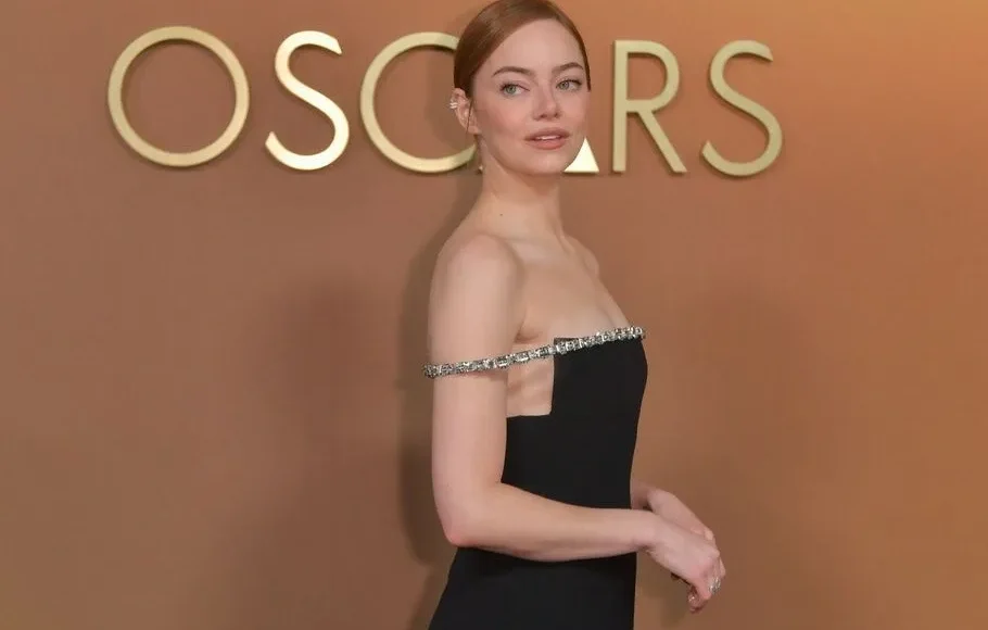 Τέλος, η Emma Stone με sleek hairstyle και ροδακινί αποχρώσεις στο μακιγιάζ.