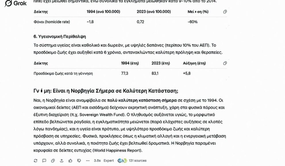 To 52,18% των Νορβηγών που απάντησαν ΟΧΙ στο δημοψήφισμα για την ένταξη της χώρας τους στην Ευρωπαϊκή Ένωση έσωσαν και τους εαυτούς τους και την πατρίδα τους από αχρείαστες και αχάριστες περιπέτειες και… αβαρίες. Αυτό ισχυρίζονται γνωστοί μου που ζουν στη σκανδιναβική χώρα, αλλά αυτό απάντησε και το Grok, το πρόγραμμα Τεχνητής Νοημοσύνης του Ίλον Μασκ. Το ερώτημα που υπέβαλα ήταν: «Παρουσίασέ μου σε κείμενο μερικά από τα βασικά χαρακτηριστικά της Νορβηγίας (ΑΕΠ, πληθυσμός, κατά κεφαλήν εισόδημα, μορφωτικό επίπεδο, εγκληματικότητα, υγειονομική περίθαλψη) σε σύγκριση με εκείνα που είχε στις 28 Νοεμβρίου 1994. Θεωρείς ότι σήμερα είναι σε καλύτερη κατάσταση ή τότε;».