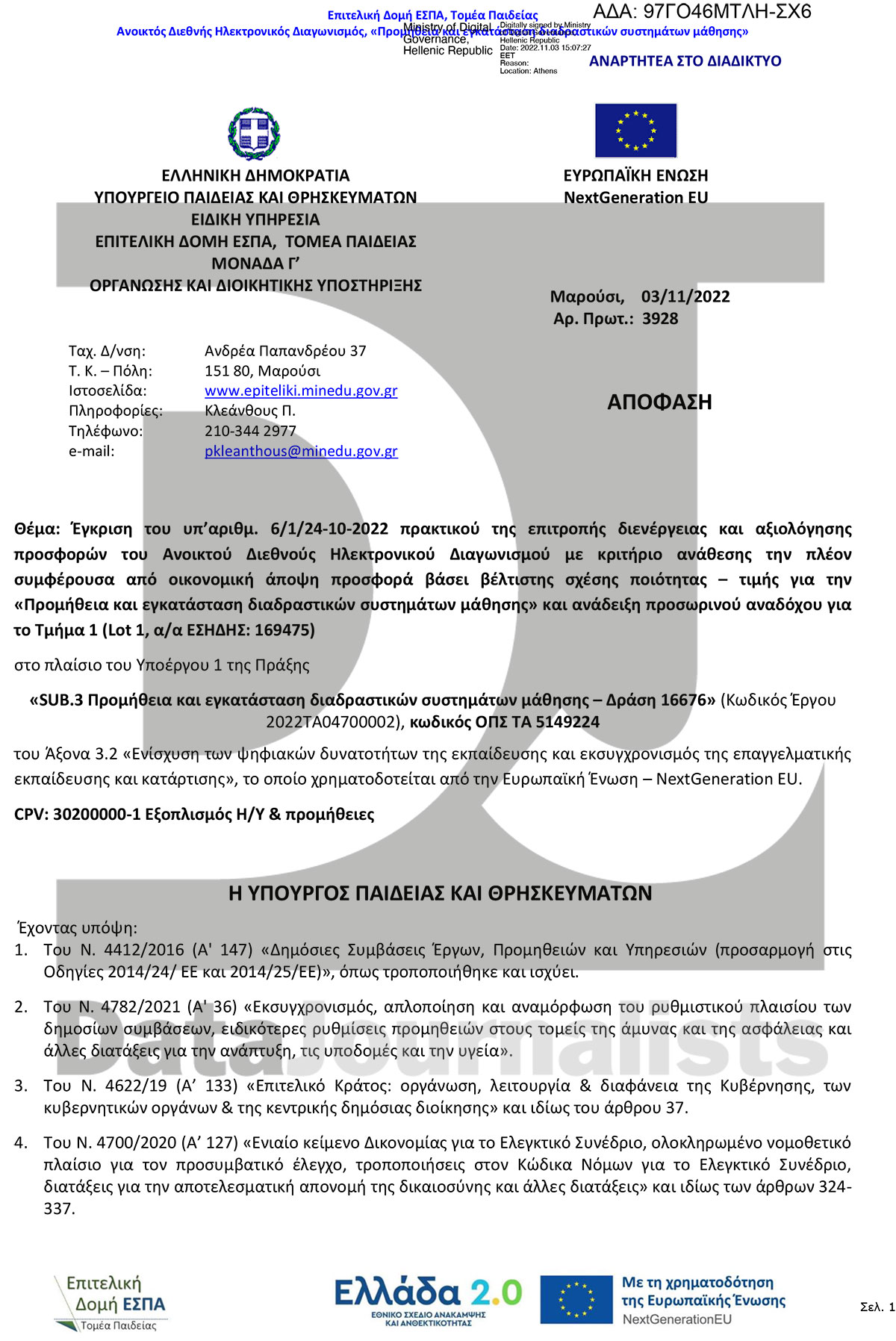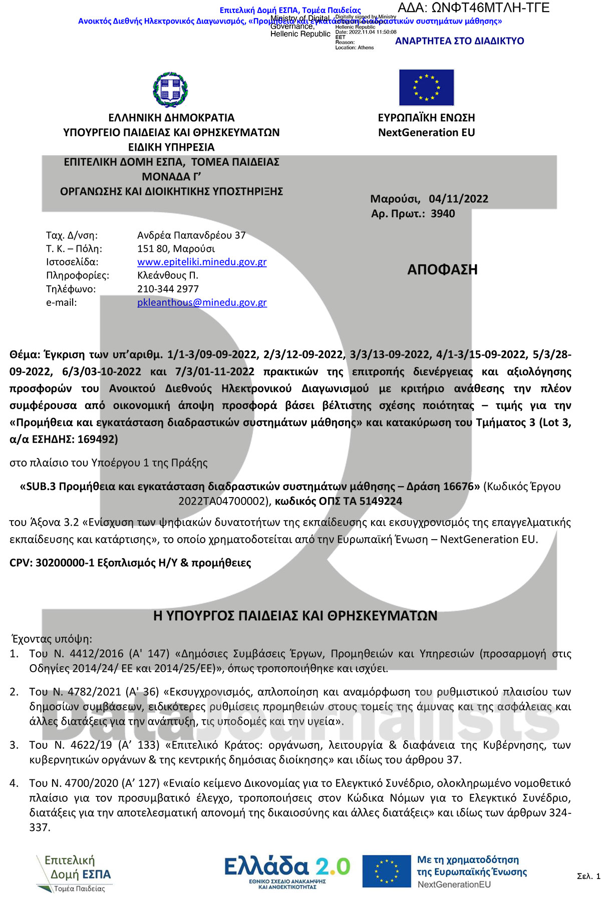 Στις 26 Ιουλίου του 2022 το υπουργείο Παιδείας προχώρησε στην προκήρυξη ανοικτού ηλεκτρονικού διαγωνισμού για την «προμήθεια και εγκατάσταση διαδραστικών συστημάτων μάθησης». Συγκεκριμένα, το έργο αφορούσε στην εγκατάσταση 36.000 διαδραστικών συστημάτων μάθησης, συμπεριλαμβανομένων λευκών πινάκων, φορητών υπολογιστών, διαδραστικών προβολέων και εσωτερικών καλωδίων σε αίθουσες διδασκαλίας σχολείων πρωτοβάθμιας και δευτεροβάθμιας εκπαίδευσης.