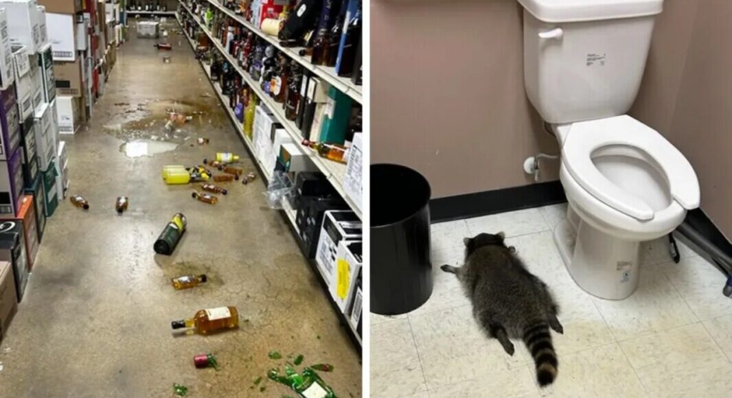 Το ρακούν είχε καταφέρει να εισβάλει στο κατάστημα, ήπιε ποτά που βρήκε στο τελευταίο ράφι της κάβας και από το μεθύσι, λιποθύμησε στο μπάνιο ανάμεσα στην τουαλέτα και τον κάδο.