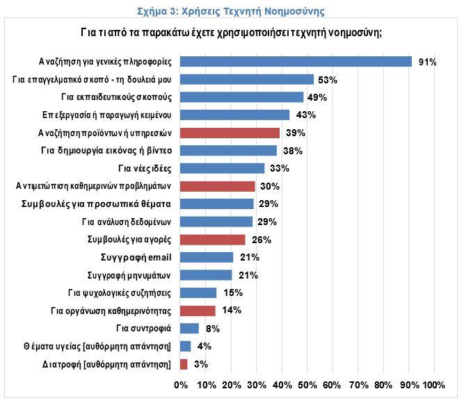 Τα ποσοστά υποδηλώνουν ότι η ΤΝ δεν αποτελεί πλέον εξειδικευμένη τεχνολογία, αλλά ένα ευρέως χρησιμοποιούμενο μέσο υποστήριξης σε πλήθος δραστηριοτήτων. Οι χρήστες ΤΝ – δηλαδή περίπου το 50% του πληθυσμού – την αξιοποιούν κυρίως για: